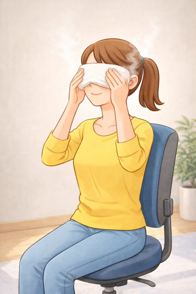 蒸しタオルやホットアイマスクで目元を温めると、目の奥の重さがやわらぎやすくなります。