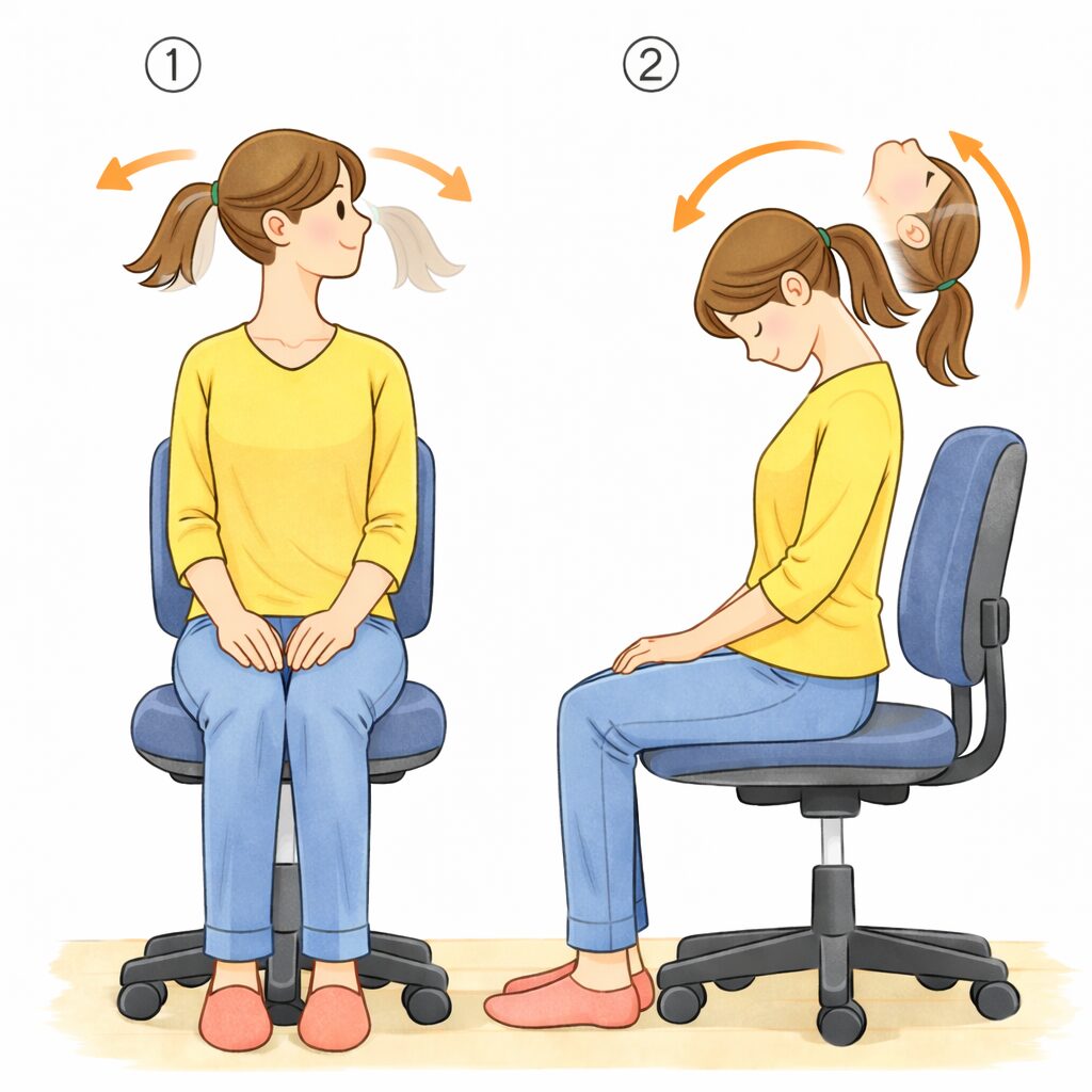 ①背筋を伸ばして座り、首をゆっくり左右に向ける