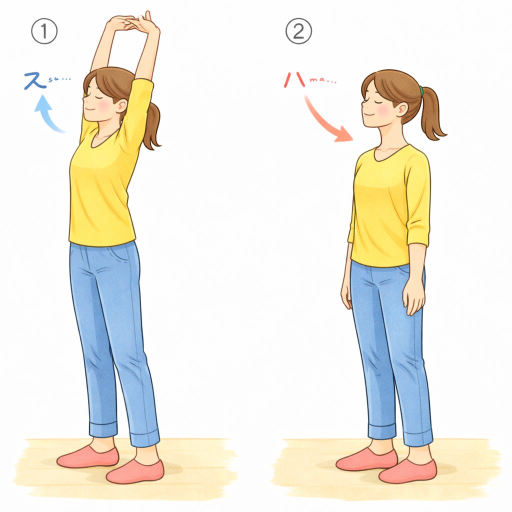 ①立ち上がって背筋を伸ばし、息を吸いながら両腕を上に伸ばす
