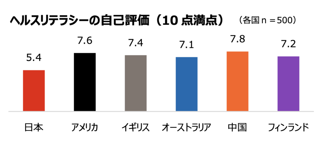 ところが、国際調査によれば、日本人のヘルスリテラシー自己評価は10点中5.4点と6か国中最下位という結果もあるほどで実はあまり高くありません。
