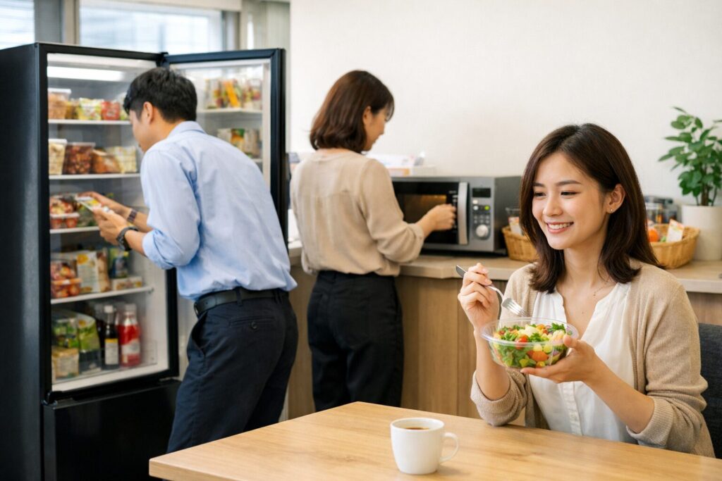 あるオフィスでは、昼休みに外へ買いに行く人も多く「ランチの選択肢をもう少し増やしたい」という声が上がっていました。そこで常温タイプの置き型社食サービスを導入したところ、次のような変化が見られるようになりました。