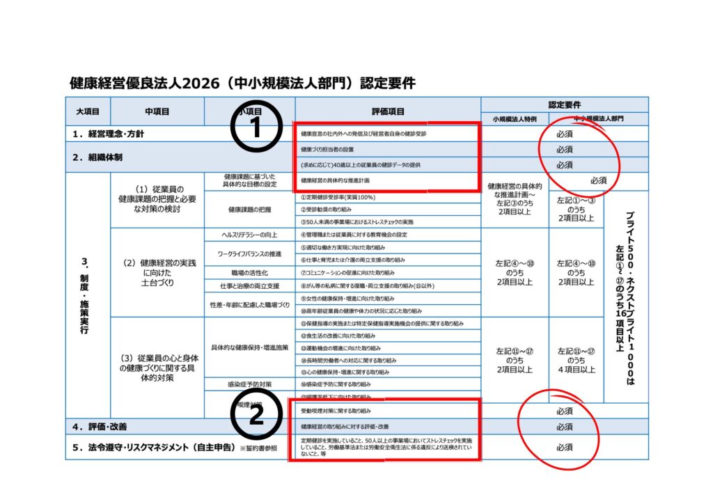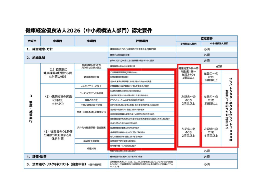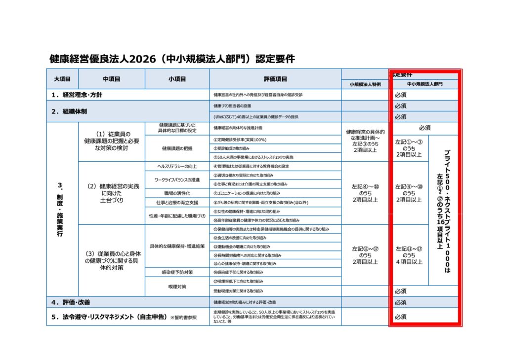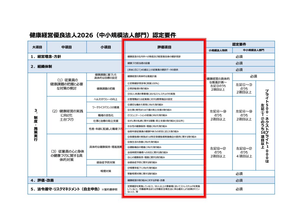 太赤で囲んだ部分が、健康経営優良法人の【必須項目】です。