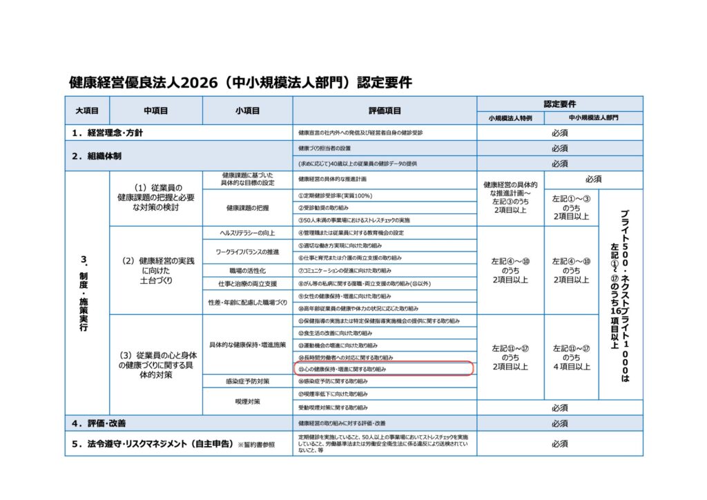 (参考:健康経営優良法人2026(中小規模法人部門)認定要件より)