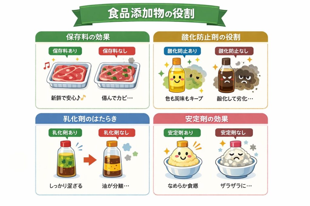 味や見た目を整えるためだけでなく、食品を安全に保ち、品質を安定させる目的で使用されています。